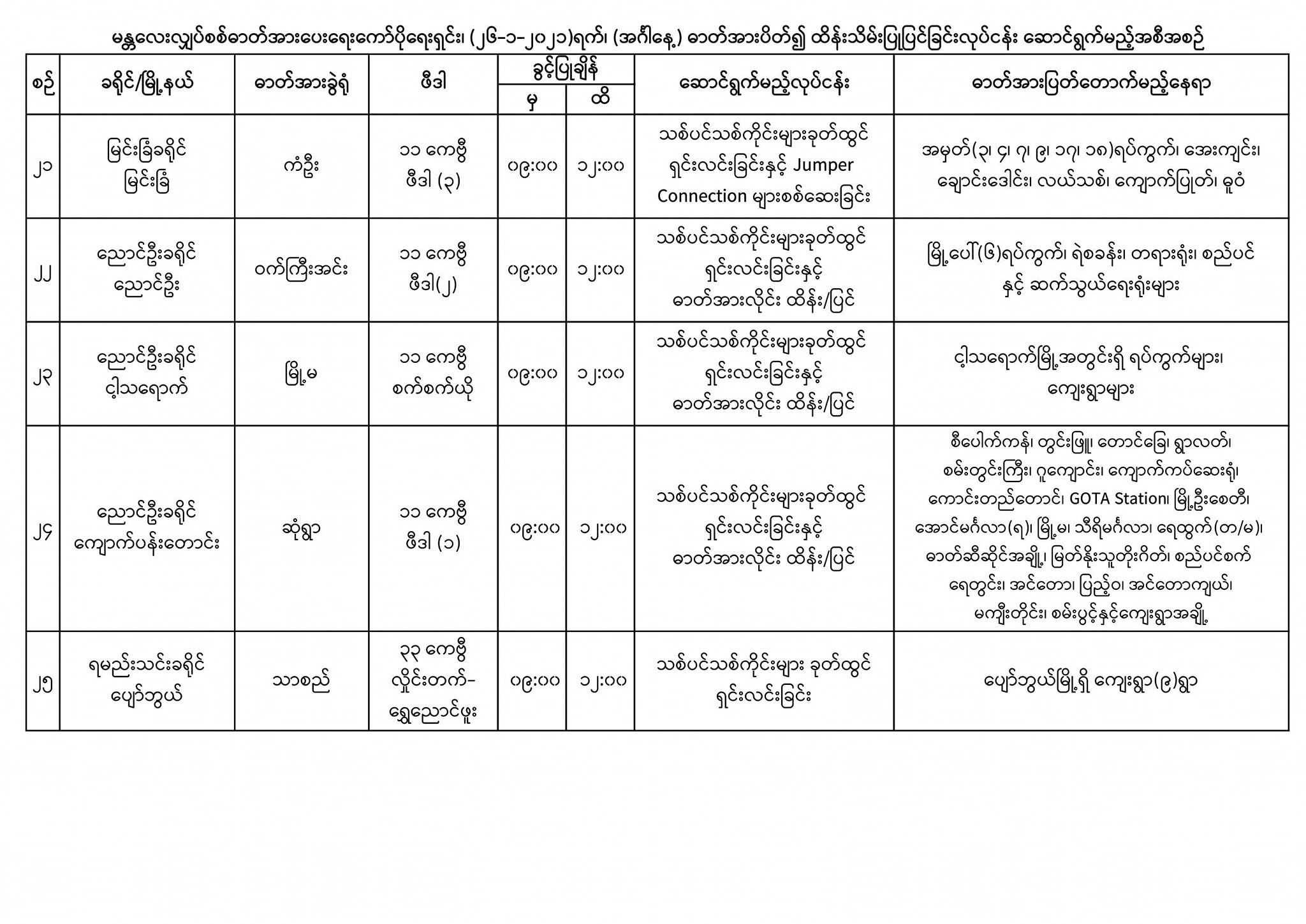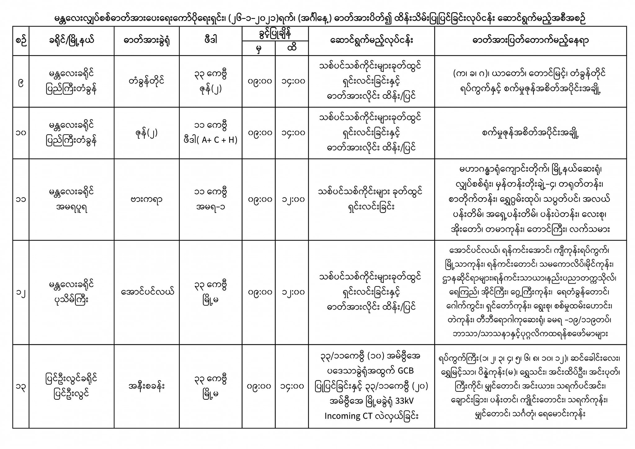 မန္တလေးတိုင်းဒေသကြီး အတွင်းရှိ ဓာတ်အားခွဲရုံများ၊ ဓာတ်အားလိုင်းများ ကြံ့ခိုင်မှုရှိစေရေးနှင့် အများပြည်သူများ လျှပ်စစ်အန္တရာယ် ကင်းဝေးရေးတို့အတွက် ခရိုင်များ၊ မြို့နယ်များ၊ ရပ်ကွက်များ၊ ကျေးရွာများတွင် Distribution Transformer များ ထိန်းသိမ်းပြုပြင်ခြင်း လုပ်ငန်းများ၊ ရေရှည်ဓာတ်အားတည်ငြိမ် ပြည့်ဝစွာ ပေးနိုင်ရေးအတွက် ဟောင်းနွမ်း၍ ဝန်အားမနိုင်တော့သော (၁၁) ကေဗွီ ဓာတ်အားလိုင်းကြိုးများအား ကြိုးအသစ်များဖြင့် လဲလှယ်ခြင်းလုပ်ငန်းများနှင့် ဓာတ်အားပြတ်တောက်မှု လျော့နည်း ကျဆင်းစေရေးအတွက် သစ်ပင်သစ်ကိုင်းများ ခုတ်ထွင်ရှင်းလင်းခြင်း လုပ်ငန်းများကို ဆောင်ရွက်သွားမည်ဖြစ်သည်။